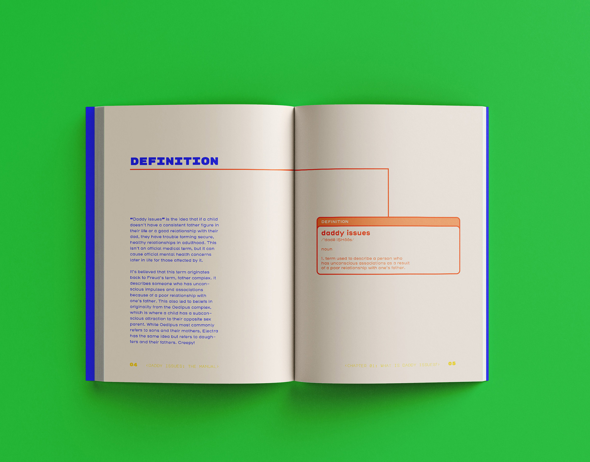 Daddy Issues: The Manual was my senior capstone project. I created this guidebook to introduce the meaning of the topic, give insight on men's mental health, and explore methods of prevention and resolution, all for the purpose of breaking the cycle of trauma from generation to generation. This topic is important to me because I've seen it significantly affect those who I care about. I want to help understand and implement change in others' lives, and by creating this book, I hope to make and impact on someone even if it's just simply informing them about the topic. Knowing it exists and it's something to avoid, can make a world of a difference for someone's life.