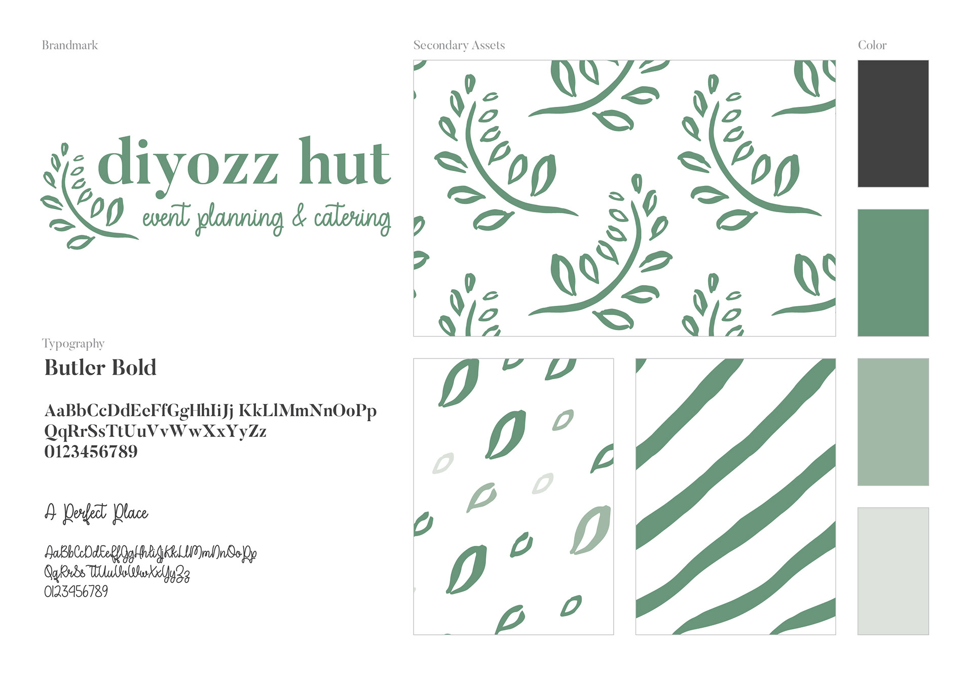 Below are the final brandmark and secondary assets for Diyozz Hut. The leaf represents the way Limi decorates her events, with lots of greenery and foliage. The sage color fit the authentic, hand-drawn feel of the branch and the leaves. Coming all together, this look captures the principles Limi, her business, and her community is all about.